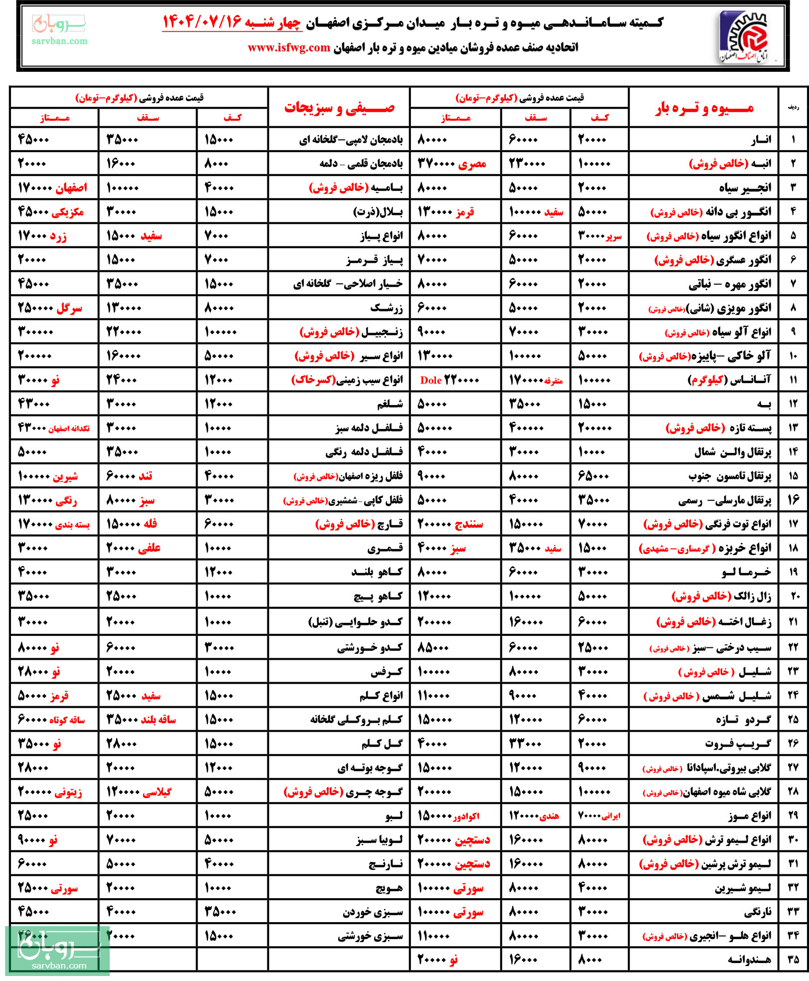 جدیدترین قیمتی که از سوی اتحادیه بارفروشان برای میدان مرکزی میوه و تره بار بارفروشان اصفهان(نرخنامه) منتشر شده است.