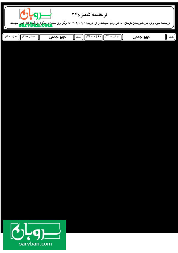 جدیدترین قیمتی که از سوی اتحادیه بارفروشان برای میدان مرکزی میوه و تره بار میادین میوه و تره بار کرمان (نرخنامه) منتشر شده است.
