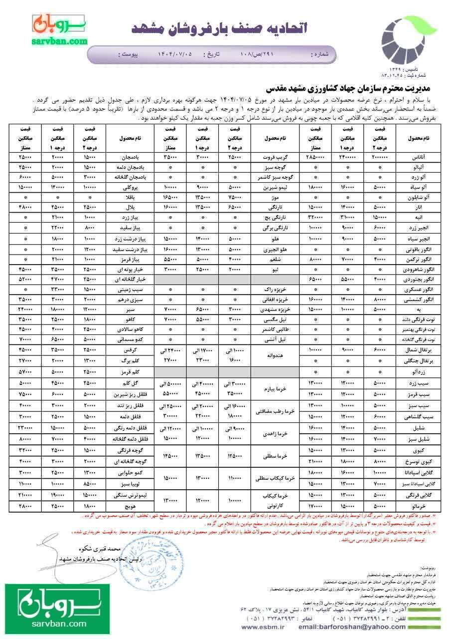 جدیدترین قیمتی که از سوی اتحادیه بارفروشان برای میدان مرکزی میوه و تره بار میادین میوه و تره بار مشهد (نرخنامه) منتشر شده است.