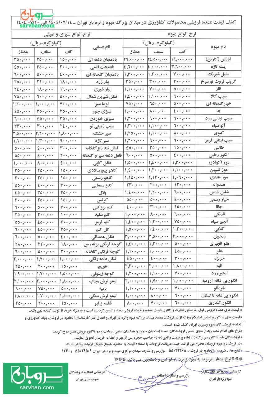 جدیدترین قیمتی که از سوی اتحادیه بارفروشان برای میدان مرکزی میوه و تره بار بارفروشان تهران(نرخنامه) منتشر شده است.