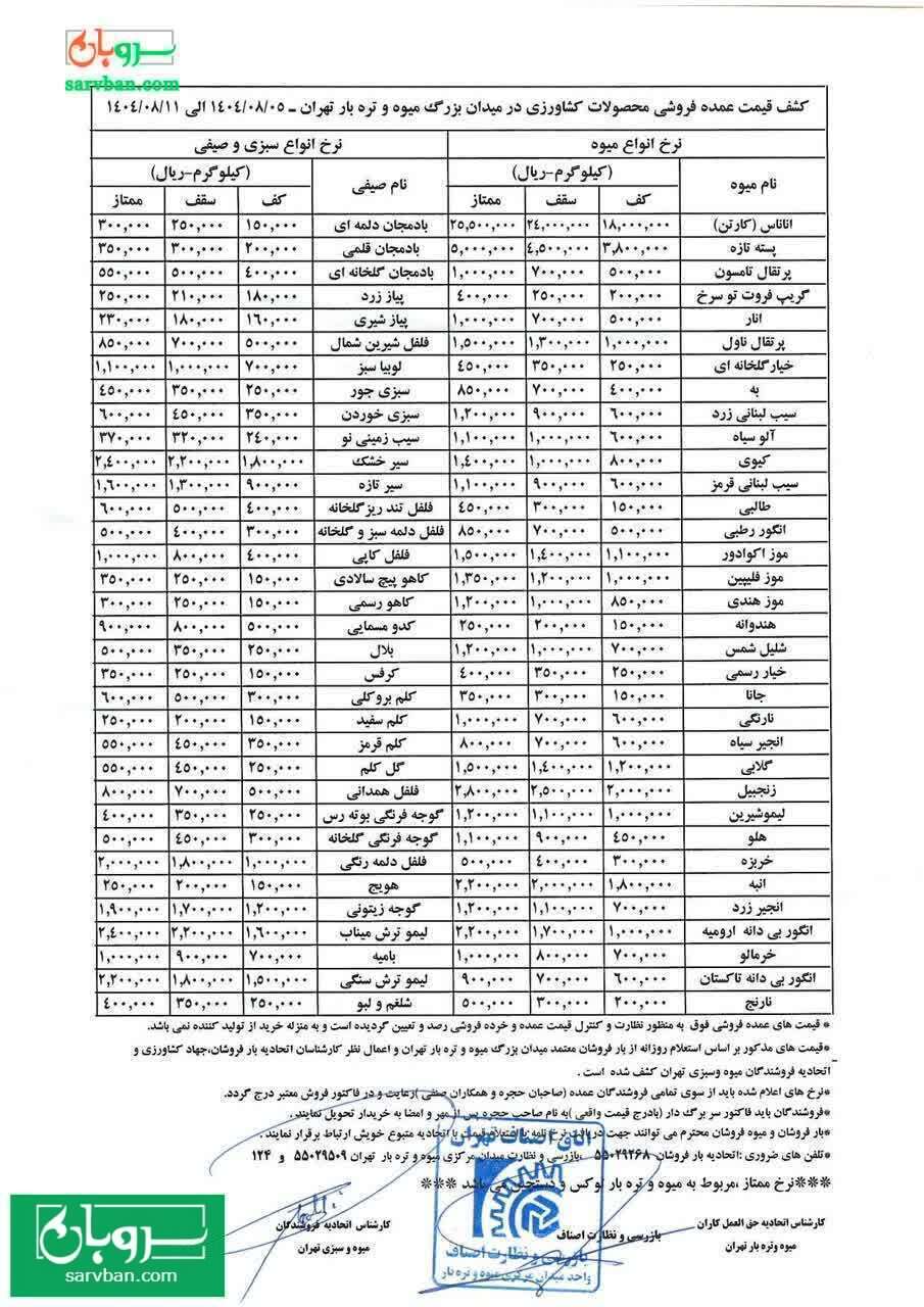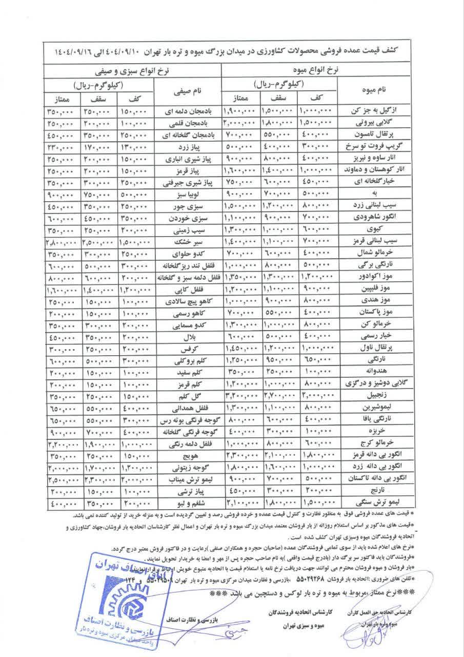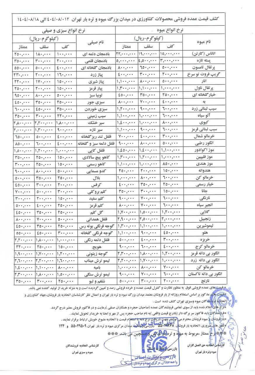 جدیدترین قیمتی که از سوی اتحادیه بارفروشان برای میدان مرکزی میوه و تره بار بارفروشان تهران(نرخنامه) منتشر شده است.