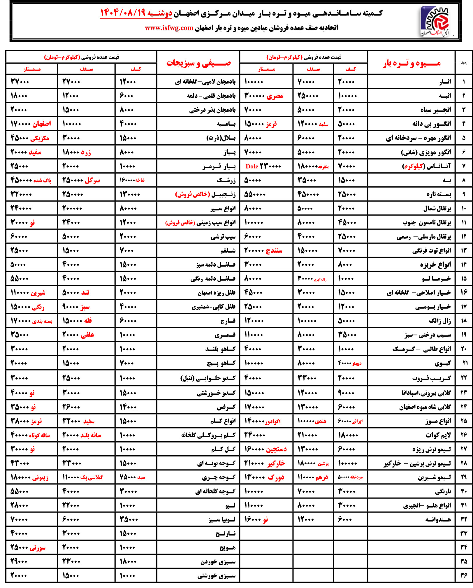 جدیدترین قیمتی که از سوی اتحادیه بارفروشان برای میدان مرکزی میوه و تره بار بارفروشان اصفهان(نرخنامه) منتشر شده است.