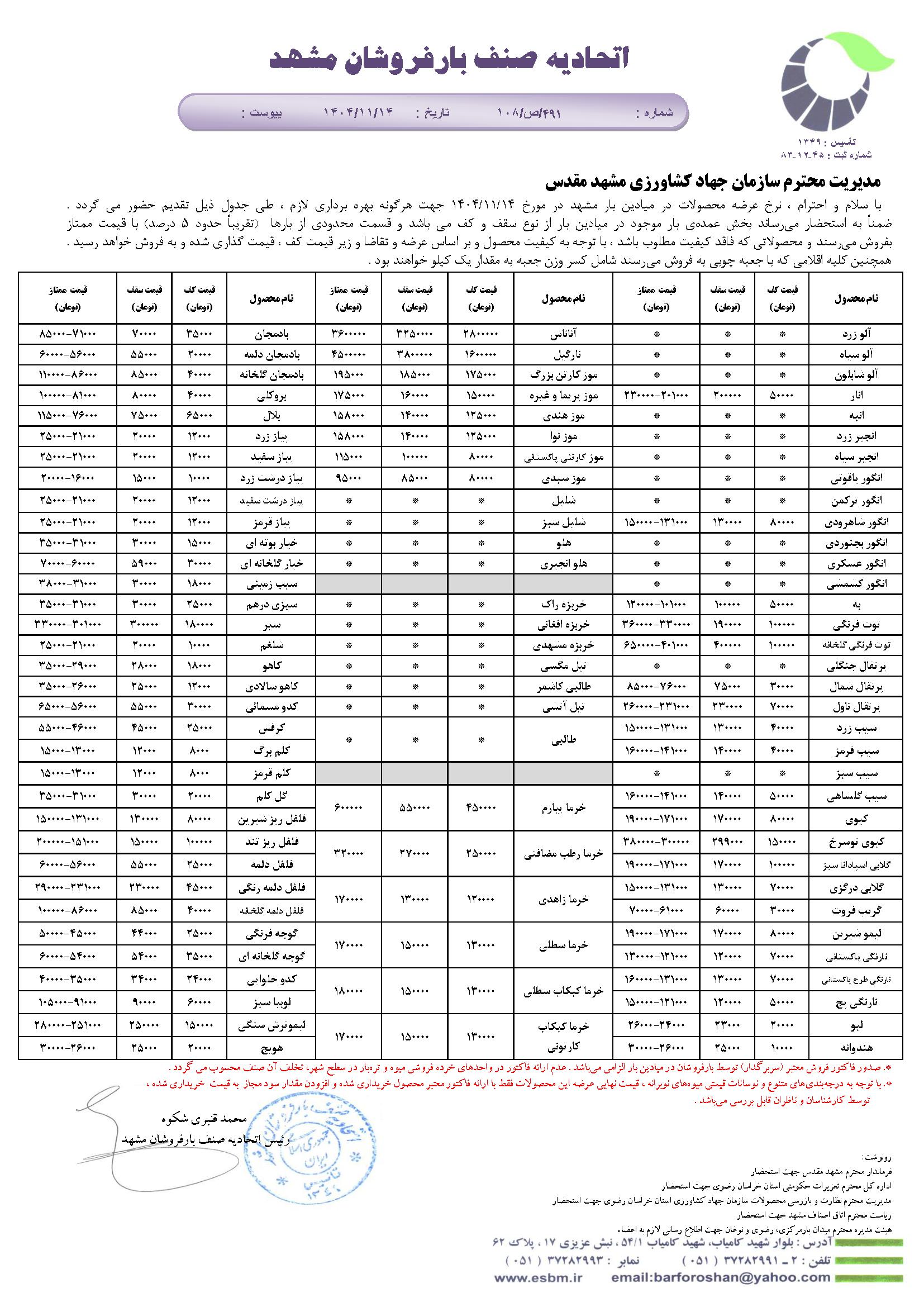 جدیدترین قیمتی که از سوی اتحادیه بارفروشان برای میدان مرکزی میوه و تره بار میادین میوه و تره بار مشهد (نرخنامه) منتشر شده است.