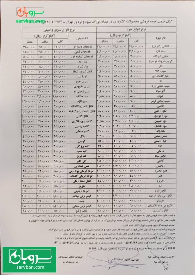 جدیدترین قیمتی که از سوی اتحادیه بارفروشان برای میدان مرکزی میوه و تره بار بارفروشان تهران(نرخنامه) منتشر شده است.